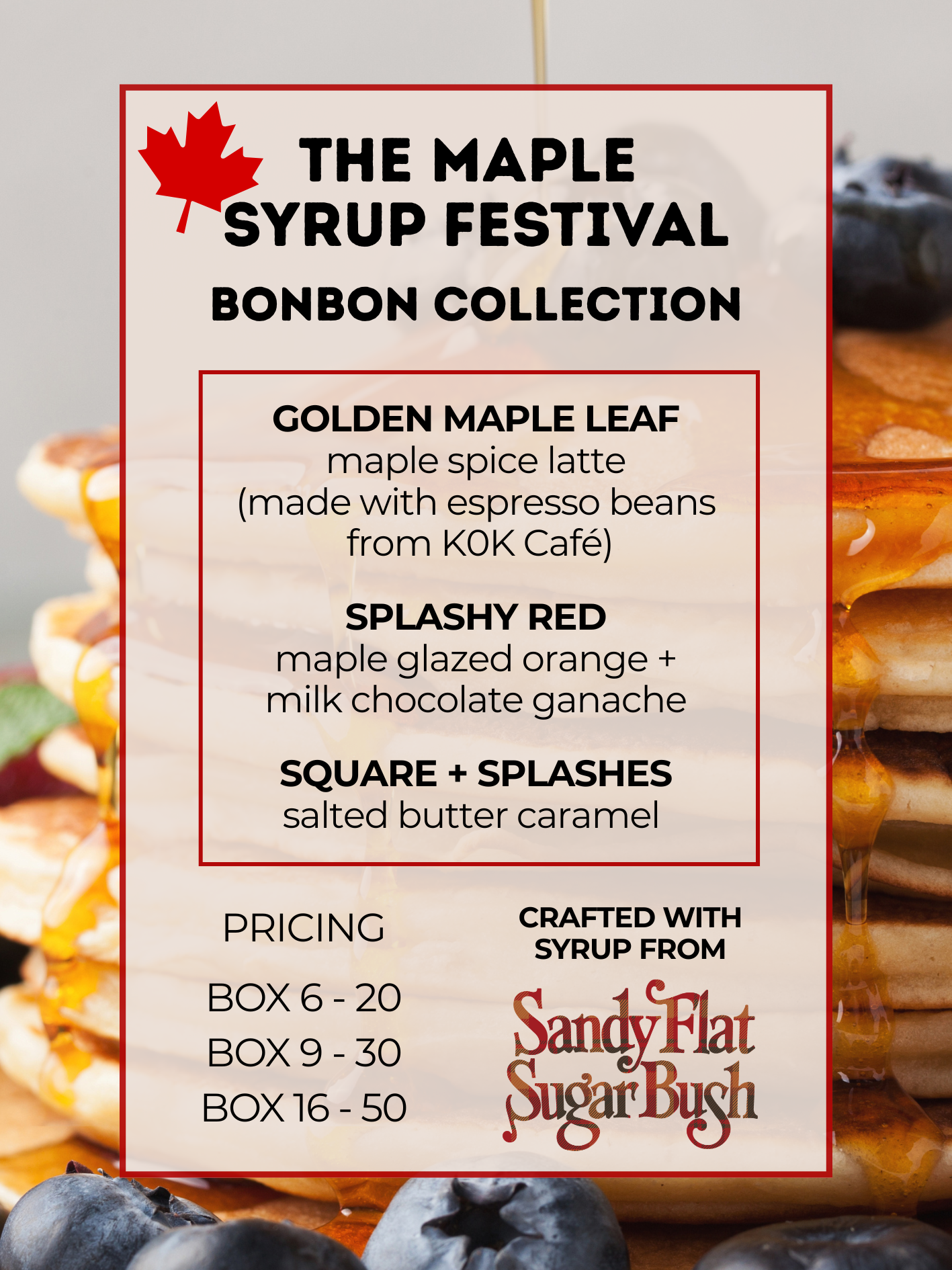 Each of our ganaches and caramels are made with Ontario butter and cream and all of our syrup comes from our local Sandy Flat Sugar Bush.