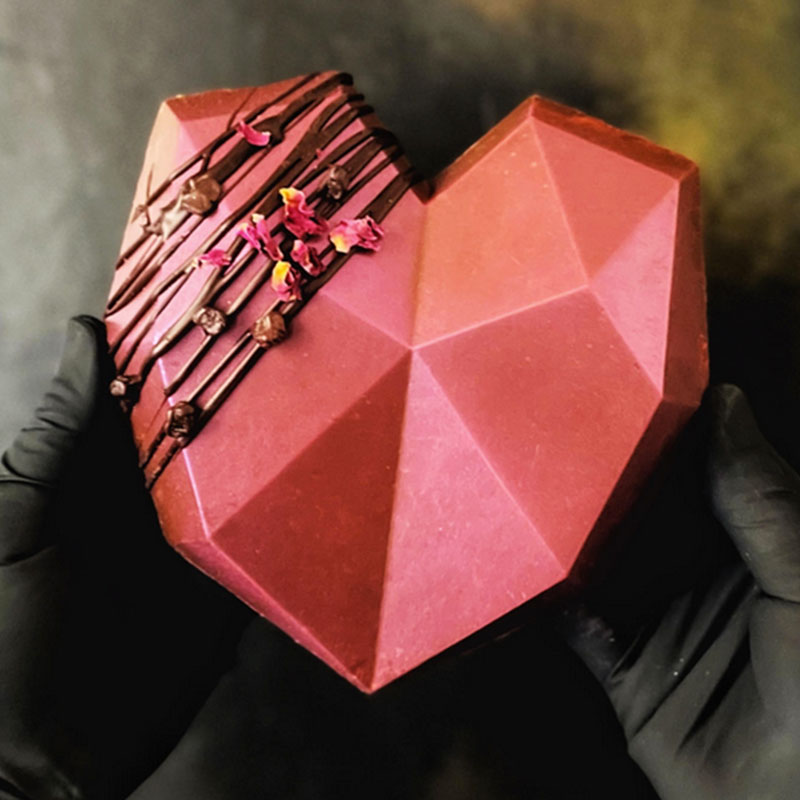 It’s a solid, dark chocolate heart, blended with crisped rice and studded with chunks of sponge toffee, whole freeze dried local strawberries and nuggets of strawberry ice cream.  Finished with chocolate rocks and rose petals.